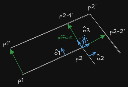 $\hat o 1$은 점 p1과 점 p2 직선에 대한 직교벡터이고 $\hat o 2$는 점 p2과 점 3 직선의 직교벡터이다. 점 p1의 오프셋은 점 p1’을 구하는 작업이 쉽다.