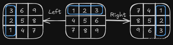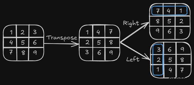 행렬 회전은 행렬 전체가 가운데 기준을 가지고 왼쪽 혹은 오른쪽으로 90도 회전하는 것을 말한다. 행렬을 회전하는 방법은 직접 위치를 이동하거나 전치행렬을 이용한 방식이 있다. 하나씩 살펴보자.