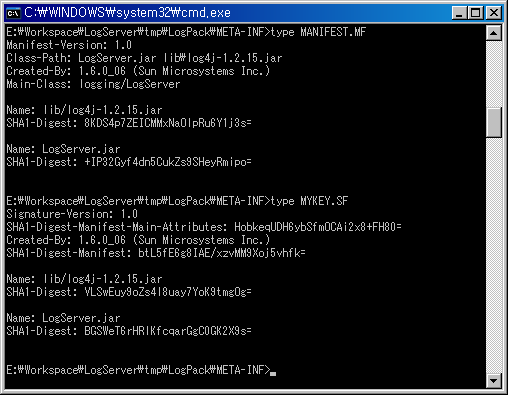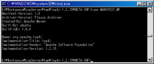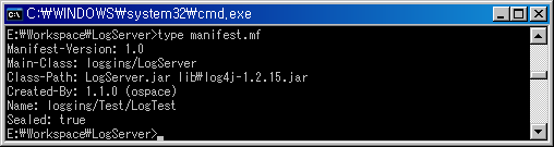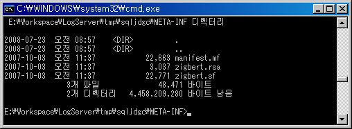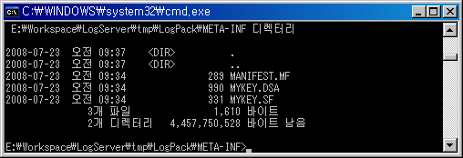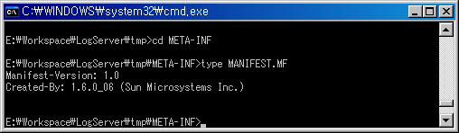 jar xvf LogServer.jar 옵션 "x"는 압축을 풀겠다는 의미이고 "v"는 작업 과정을 표시하는 것이고, "f"는 압축을 풀 파일을 지정하겠다는 의미이다. 실제 압축을 푼 내용을 보면 내가 추가하지 않은 파일도 보인다. META-INF 디렉토리에 있는 MANIFEST.MF파일이다. 이는 jar가 자동으로 생성되며 단순히 현재 버전 정보만 들어가 있다. 이들의 특별한 역활은 아래에서 보도록 하겠다.