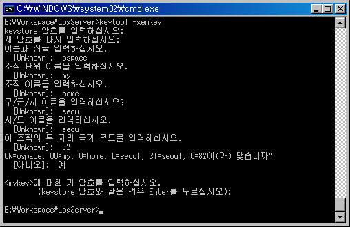 jar파일에 서명하기 위해서는 공개키/개인키를 생성해야한다. 자신만의 서명이 있어야된다. 이때 사용하는 명령이 keytool이다. 아래 처럼 간단히 키를 생성하면 된다.
