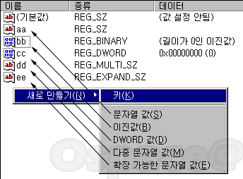 키는 레지스트리 편집기에서 보면 왼쪽창에 폴더 모양으로 있는 것이다. 해당 키를 선택했을 경우 위 그림처럼 나오는 것이 키에 대한 값이다. 값 타입은 총 5가지로 되어 있다.