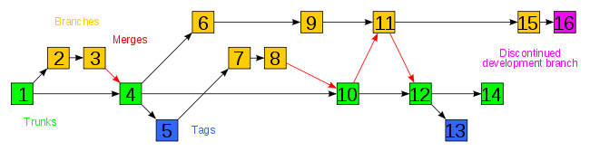 다시 trunk, branches와 tags의 브런칭 개념의 소스관리 방법은 Perforce라는 Perforce co.,에서 개발한 소스관리 프로그램에서 기인한다. 브런칭은 가지 분리하는 것으로 각 가지별로는 소스관리를 독립적으로 수행하는 형태이다.
