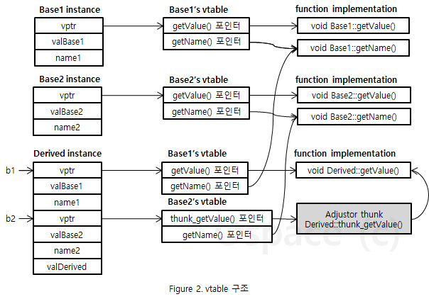 위의 그림은 실제 구현된 객체의 메모리 구조를 그린 것이다. 그림에서 보듯이 각 가상함수 테이블의 멤버함수는 함수 구현 위치로 연결되어 있다. 그러나 Derived에서 Base2 인스탄스에서의 getName 함수 호출 방식은 틀리다.