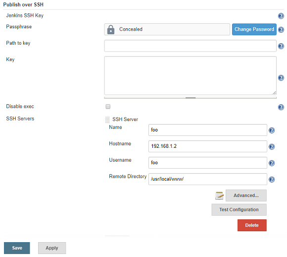 상단에 jenkins에서 사용할 공통 키를 입력할 수 있고, SSH Server 추가시 키가 다른 경우 별도로 입력할 수 있음.