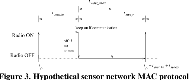 여기에 사용된 hypothetical MAC 프로토콜은 T-MAC 프로토콜과 유사하며 스케줄된 간격마다 라디오를 온과 오프를 수행한다.