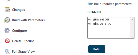 git 배포시 사용해보자. git 프로젝트에 들어가면 왼쪽에 “Build with Parameters”가 있다. 이를 선택하면 오른쪽에 선택할 수 있는 화면이 표시된다.