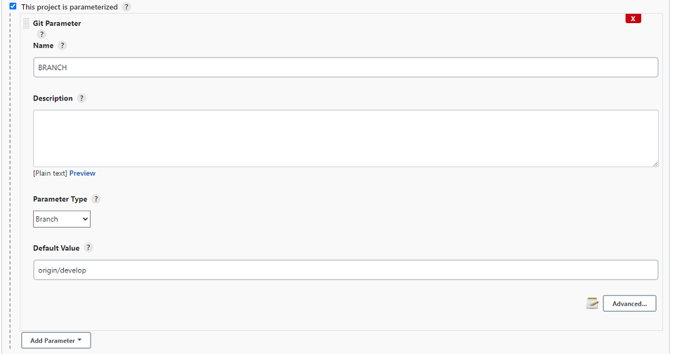 git parameter을 사용하기 위해 프로젝트 설정에서 “This project is parameterized”를 체크 표시해야 한다. 그러면 git parameter 관련 설정 항목이 표시된다.