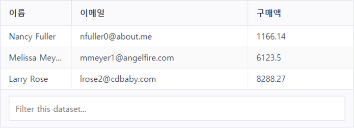 보여지는 기본 테이블 디자인이 깔끔하다. 상단에 헤더가 보이고 중간에 데이터가 출력된다. 아래쪽에서 데이터 검색 입력 창이 있다. 차체적으로 기본적인 검색 기능도 가능하다.