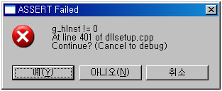 이에 대한 자료는 인터넷에서도 거의 발견할 수 없었다. 특히 0x80000003에 대한 에러코드는 E_INVALIDARG로 잘못된 인자로만 나오고 RegSvr32 관련해서 나오는 문제는 인터넷 상에서 거의 찾아 볼 수 없었다. 그리고 ASSERT에러에서 g_hInst 관련한 것은 아애 없다고 보면된다.