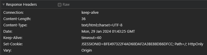 "/hello"라는 API를 호출한 결과를 확인할 수 있다. 그리고 session ID 값이 "BFE497322F4AD60DAF2A3BE88DB6DFCC" 임을 확인할 수 있고, 실제 cookie를 확인하면 JSESSIONID으로 저장되어 있음을 확인할 수 있다. 이는 서버에서 응답으로 cookie을 설정해서 반환해주었기 때문에 브라우저에서 이 값을 다시 설정해서 서버로 보내게 된다. 다시 spring 서버는 이 값을 확인해서 session을 식별하고 유지할 수 있게 된다.