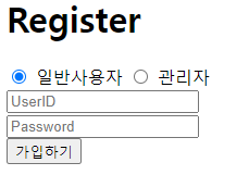 사용자 정보를 입력하는 HTML 폼 페이지이다. POST 형식으로 "/register"으로 호출하고 있다. /resource/static/ 디렉토리에 register.html 파일을 생성해서 아래 내용을 입력한다. 추가된 부분은 사용자 권한를 선택하는 라디오 버튼이다.