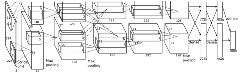 대표적인 CNN 이미지 식별 알고리즘으로 총 8개 계층으로 1000 클래스 이상 분류 가능하다. 5개의 CNN, 몇 개의 맥스풀링 층, 2개 전역 연결 층으로 구성되어 있다. 총 6천만 개 파라미터와 5십만개 신경을 가진다.