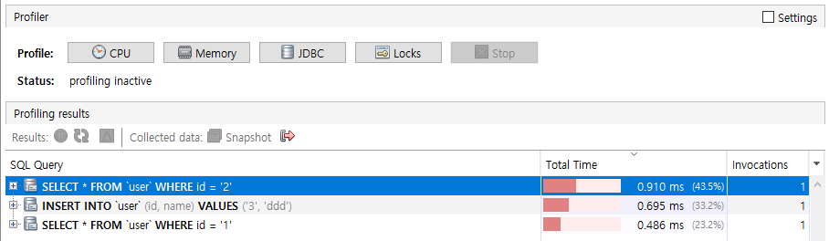 JDBC 호출에 대한 프로파일링을 할 수 있다. 호출된 쿼리 및 실행 정보 제공한다.