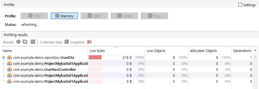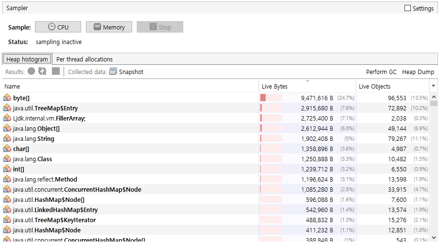 메모리 사용 프로파일링이다. 사용 메모리량, 객체 정보 제공한다.