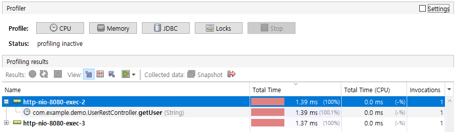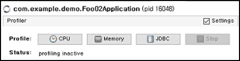 프로파일러는 프로세스에서 선택된 정보에 대해서 프로파일링을 시작한다. 프로파일링은 실행되는 모든 정보를 추적한다. 애플리케이션 튜닝에 활용할 수 있다. 사용하는 방법을 앞의 샘프링과 비슷하다. 시작은 프로파일링 대상을 선택하고 중지하려면 Stop 버튼를 클릭한다.