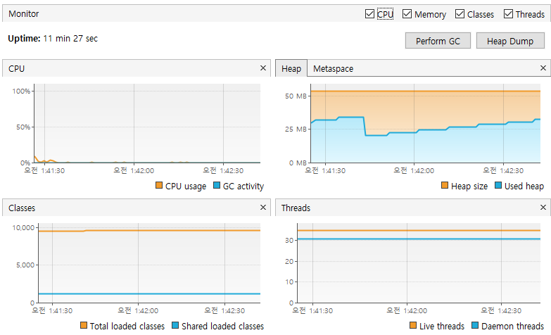 모니터탭에서는 현재 프로세스가 사용중인 리소스 정보를 표시한다. 표시하는 리소스 정보는 CPU, Heap, Classes, Threads 정보 실시간으로 표시해준다.