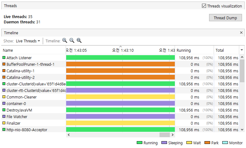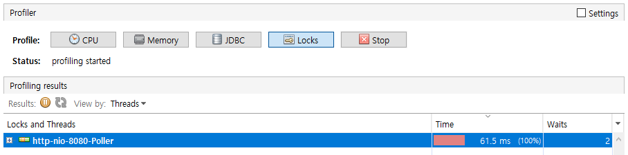 쓰레드에 대한 프로파일링을 할 수 있다. 실행되는 쓰레드 정보를 확인할 수 있다.