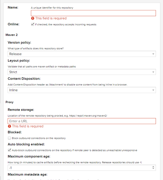 리포지토리 생성시 Maven 기준으로 보면 maven2 (group), maven2 (hosted), maven2 (proxy)가 있다. 타입을 선택했다면 리포지토리 추가 정보 입력한다.
