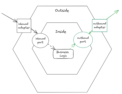 외부영역에는 외부에서 요청을 받는 인바인드 어댑터(inbound adapter)와 외부 연계되는 아웃바운드 어댑터(outbound adapter)가 있다. 내부 영역에는 비즈니스 로직을 호출위한 인바운드 포트가 있고 외부 영역 호출하는 아웃바운드 포트가 있다. 외부에 있는 인프라라고 해도 애플리케이션 영역에 포함되는 대상이 있고 포함되지 않은 영역도 있다.