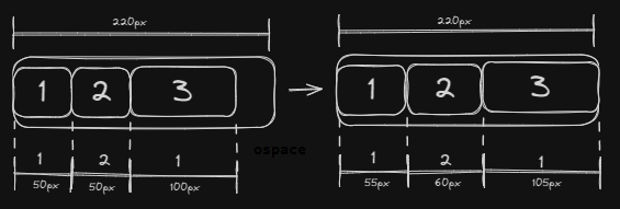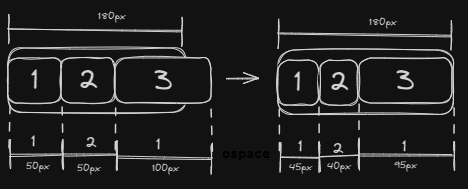 결국 폭 220px 크기인 Flex container에 1:2:1 비율인 Flex item 들이 있다고 하자. 그럼 여백 20px이 각 Flex item에 비율에 맞게 각각 5px(20 x 25%), 10px(20 x 50%), 5px(20 x 25%)이 증가한다.