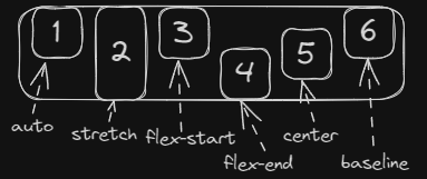 align-items는 한줄 인 경우 Cross axis 방향의 정렬을 설정한다. flex-wrap에 wrap이 설정되어서 두줄 이상이 되었다면 align-content 속성이 먼저 적용된다. 적용할 수 있는 값은 아래와 같다.