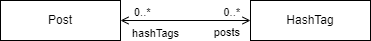 이번에는 M:N 연관 관계를 살펴보자. M:N 관계는 사로 관계가 1개가 아닌 여러 개로 서로 연관되어 있는 형태이다. 이번 예는 게시글과 해시태그 관계이다. 게시글은 여러 해시태그를 가질 수 있고 한 해시태그도 여러 게시글에 사용될 수 있다.