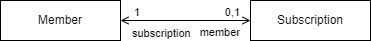 1:1 연관관계는 @OneToOne 어노테이션을 사용한다. 예를 들어 구독을 위한 서비스로 구독 엔티티와 멤버 간에 관계를 보자. 구독은 서비스에 가입하면 생성 되고 이를 가입한 멤버가 존재한다. 멤버는 한번만 구독할 수 있다. 이를 클래스 다이어그램으로 표현하면 다음과 같다.