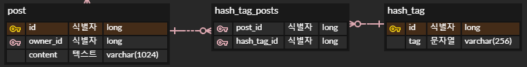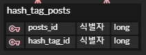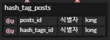 HashTag 엔티티에 대한 연결 필드가 생겼으므로 HashTag에 대한 외래키로 “hash_tags_id”가 사용된다.