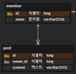 post 테이블의 외래키 owner_id을 통해서 member 테이블과 1:N 관계를 갖는다.