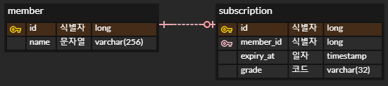 Subscription 테이블과 Member 테이블 간에 1:1 연관관계를 가진다. 그래서 Subscription은 Member에 대한 참조를 하게 된다. 이를 데이터베이스 ERD로 표현하면 아래와 같다.