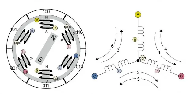 소문자로 표시된 코일은 서로 연결되고 com 부분은 하나로 접점된다. 이렇게 만든 이유는 개별 코일 별도로 제어하려면 코일 개수에 2배인 12개 접점이 생긴다. 물론 맞은편 코일이 한쌍으로 묵어서 사용할 경우 6개 점점으로도 제어 가능하다. com 점접 사용한 방식인 경우 6개 접점이 아닌 3개 접점만 생긴다. 각 3개 접점인 ABC에 전압을 인가하여 전자석를 만들어서 회전을 하게 된다. 코일의 개수는 모터마다 다르다.