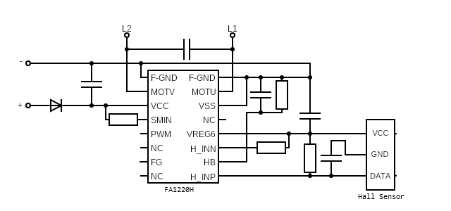 FA1220H은 코일이 2쌍으로 되어 있어서 코일 접점이 2개로 되어있다. 위의 회로에서 L1와 L2에 해당한다. 홀센서는 H_INN, H_INP 그리고 HB가 사용된다. Hall Sensor 전원으로 HB가 사용되지만, 전압이 낮으면 VREG6을 사용할 수 있다. Hall Sensor 위치에 의해 현재 영구 자석이 N극이면 지나가는 전자석은 N극으로 만들어서 밀어내고 회전 방향의 전자석은 S극으로 만들어서 끌어들이면서 회전하게 한다. 즉, Hall Sensor에 의해 현재 영구자석의 회전위치를 알고 적절한 전류 방향을 컨트롤에 의해서 제어한다.