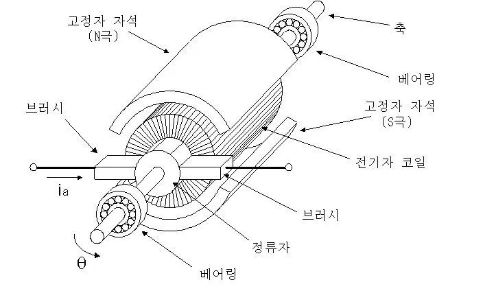 모터의 기본적인 구조는 자석의 자기력으로 인한 인력과 척력을 사용해서 회전운동을 만드는 장치이다. 다른 극은 잡아당기고(인력) 같은 극은 밀어내는(척력) 힘을 사용하여 회전시킨다. 이를 회전하기 위해 전기자를 사용해 전자석을 만들어서 회전할 때 적절한 극성으로 만들어준다. 그렇기 때문에 외부 고정자는 영구자석을 사용하고 내부 회전자가 전기자가 되어 브러시에 의해 전류 흐름을 제어한다.